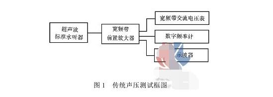 標準水聽器經過校準,它能將作用在它上面的聲壓轉換成相同頻率及波形的交流電壓信號,此電壓信號與聲壓的強度成正比。當將該水聽器插入受超聲波作用的液體介質中時,它就有一電壓信號輸出。經前置放大器不失真放大后,送入交流電壓表。數字頻率計同時測得超聲波的頻率,示波器可隨時監視信號電壓波形的變化。這一測量方法已被普遍采用了。